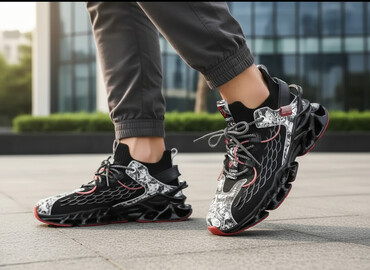 - Üst hissə: nəfəsalan mesh parça və qrafik naxışlı panellər, elastik corab-tipi