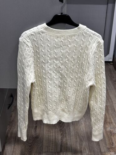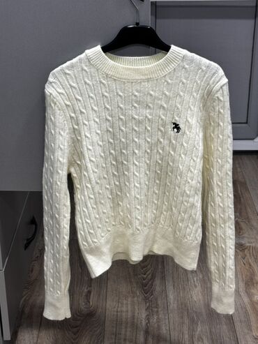 Ağ rəngli örgü sviter. 👍👍👍 - Model: dairəvi yaxalı, klassik kabel (burma) naxışlı - Material hissiyatı: yumşaq, isti və rahat - Rəng: krem/ağ - Detal: sinə hissəsində kiçik at fiqurlu işarə - Kə...