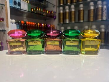 - Müxtəlif brend adlarına uyğun kompozisiyalarda ətir esansları. Şüşələrdə “My Way”, “Olympea/OLIMPEA”, “Lancome Idole”, “Giordani Gold”, “Lacoste”, “Avon Today”, “Creed Aventus”, “V. Secret Bombshell”, “Chanel Chance”, “Versace”, “Trussardi Donna”, “Xerjoff” və s. etiketli variantlar görünür.