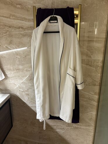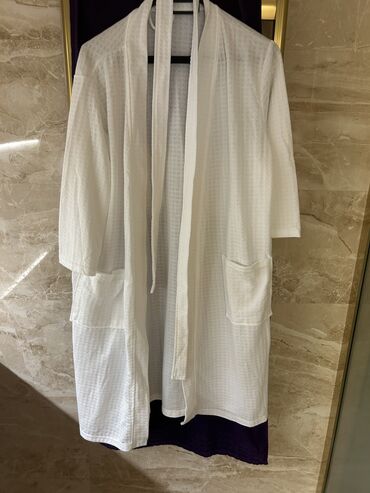 Uyğun ölçü: Asılqandakı formaya görə uniseks/standart ölçüyə yaxın. İkisi birlikdə və ya ayrıca istifadə oluna bilər: qalın xalat isti və yumşaq hiss üçün, yüngül xalat isə sürətli quruma və havadarlıq üçün. Rəng: ağ. Dizayn minimal və şık.