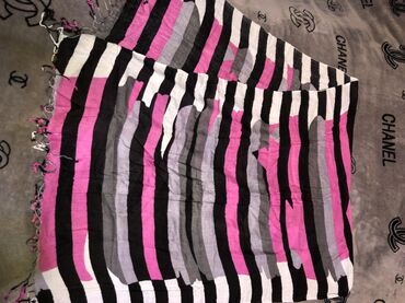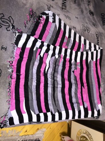 Üçbucaq formalı əl işi şal - Rəng: tünd çəhrayı/qırmızı tonlarında, ağ iplə naxışlanmış - Material: iplik toxunuşu, kənarları hörmə saçaqlı - Dizayn: mərkəzdə və yanlarda üç romb motivi, kənarlard...