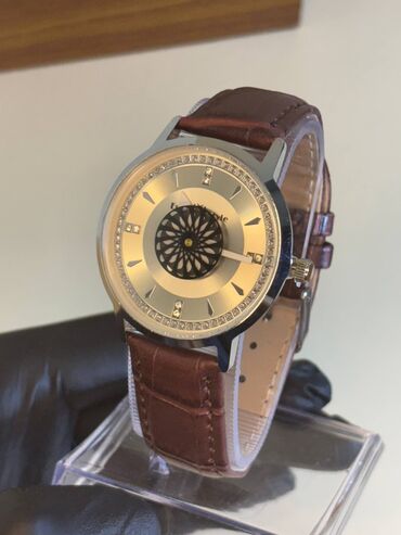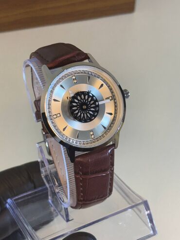 - Siferblat: qızılı/gümüşü tonlarda, kənar hissədə dekorativ daşlarla bəzədilmiş halqa, indekslər kombinə (ştrix və daş markerlər); mərkəzdə unikal həndəsi/rozetta naxışlı dekor element