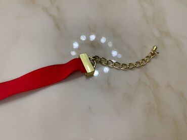 - Material: yumşaq qırmızı parça lent; qızılı rəng metal detallarla