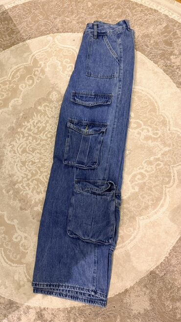 Unisex denim kargo şalvar - Material: klassik denim (cins parça), yüngülcə yuyulmuş boz-mavi rəng - Kəsim: düz/relaxed fit, yüksək belli - Bağlanma: metal düymə və fermuar - Kəmər yeri: 5 ədəd, st...