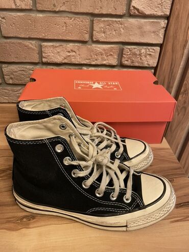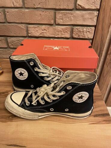 Converse, original sneaker. Sadəcə birinin içərisində daban hissəsində parçası yırtılıb, şəkildə görə bilərsiniz, başqa heç bir problemi yoxdur. Əsas Xüsusiyyətlər: Brend: Converse Model: All Sta...