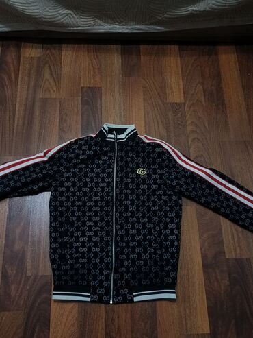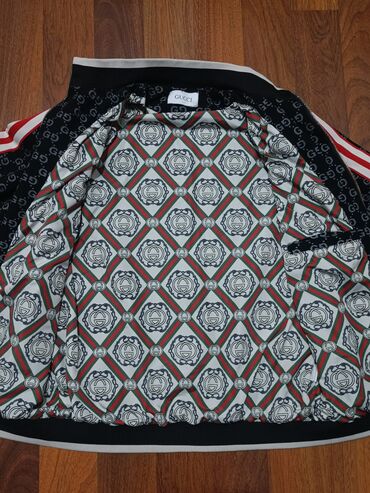 - Dizayn: Qara rəngdə, bütün hissədə “GG” monoqram naxışlı, sinədə qızılı tonlu loqo. Hər iki qolda qırmızı–ağ zolaqlar. Bomber tipli yaxa, qol və ətək hissəsində zolaqlı rezin manjetlər.