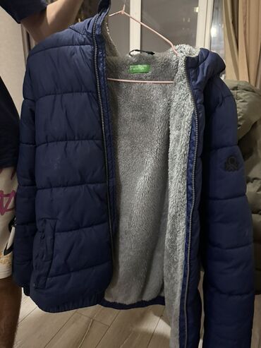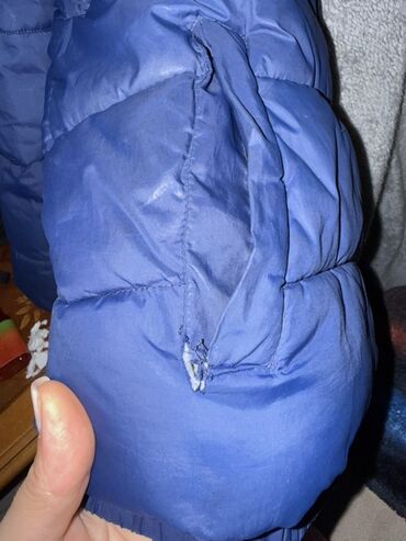 Mavi rəngdə kapüşonlu, fermuarlı qışlıq şişmə gödəkçə. İç hissəsi qalın, yumşaq tük/plyuş astarlıdır, isti saxlayır. Üz materialı su itələyən parça, üfüqi quilt (tikmə) panelləri ilə. Yanlarda iki ədəd dərin cib, ön tam uzunluqda möhkəm fermuar. Qol və ətək hissəsi elastik yığma kənarla rahat oturuş verir. Sol qolda loqo nişanı var. Çiyin və qol nahiyəsində parçada yırtıqlar mövcuddur (şəkillərdə göstərilib). Gündəlik istifadə, soyuq və küləkli havalar üçün uyğundur. Rəng: tünd-mavi. Kapüşon sabitdir.