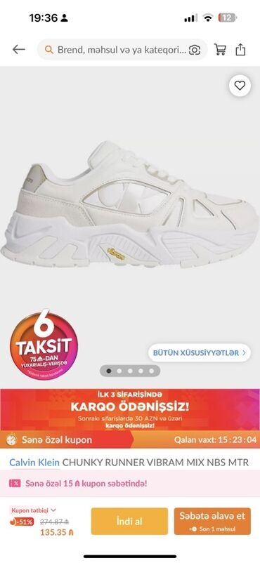 Vizualda göstərilənlər: 6 Taksit işarəsi, “İlk 3 sifarişində kargo ödənişsiz!” banneri, “Sənə özəl kupon” bildirişi, -51% endirimlə 135.35 qiymət etiketi və “Səbətə əlavə et” düyməsi.