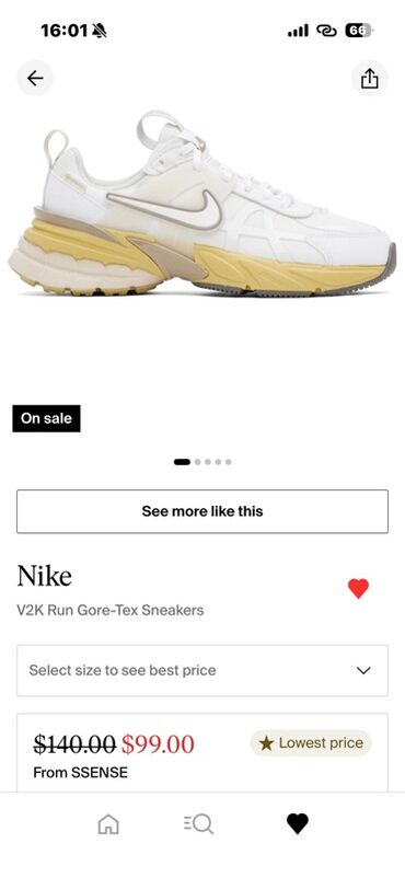 Şəkildə qeyd olunan mənbə məlumatı: SSENSE-də “On sale” olaraq göstərilib, qiymət $140.00-dan $99.00-a endirilib.