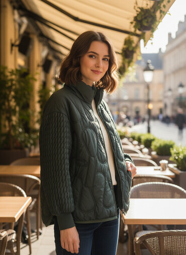 - Rəng: Boz-yaşıl (sage green) - Model: Diamond kapitone tikişli, düz kəsim, rahat oversize siluet - Bağlanma: Ön hissədə iri düymələr (5 ədəd) - Yaxa: Klassik çevrilən yaxa - Qollar: Uzun və sərbə...