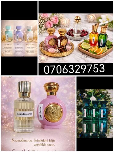 İstənilem qadın ve kişi ətirlərin sifarişi qəbul olunur. 10 azndan baslayan qiymetlerle əlaqə ücün Nazlı xanıma whatcap vasitesi ilə etrafli məlumat ala bilersiz.. Əlaqe 0706329753