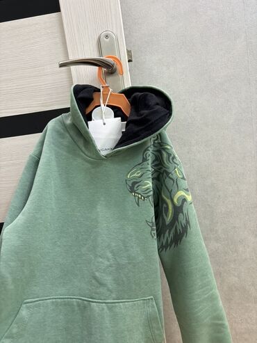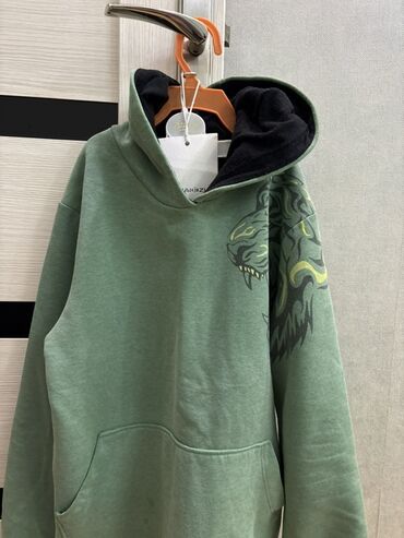 İşlənmişCAKAZZAN brendindən olan bu yaşıl hudi rahatlığı və dəbli görünüşü özündə birləşdirir. Qara astarlı kapüşon və ön tərəfində böyük kənar cib ilə təchiz olunub. Sol qolunda detallı heyvan başı dizaynı ilə fərqlənir, bu da ona unikal bir görünüş verir. Gündəlik geyim üçün əla seçimdir.