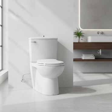 - Unitaz: üst çənli, yuxarıdan düyməli mexanizm, oval oturacaq qapağı ilə. Kompakt gövdə, arxa çıxışlı. Ağ rəngli keramikadan.