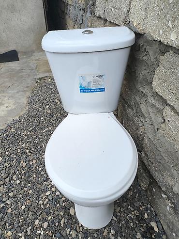 - Unitaz: üstdən düyməli çən, kompakt ölçü, ağ rəng, standart döşəmə tipli quraşdırma, yan çıxışlı drenaj, oturacaq qapağı daxil.