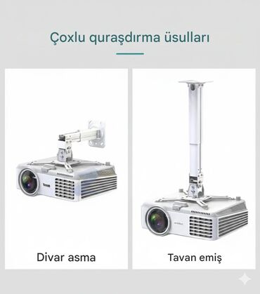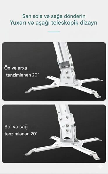 - Uyğunluq: çoxsaylı projektor modelləri üçün universal montaj qurğusu (çoxqollu baza, müxtəlif deşik aralıqlarına uyğun).
