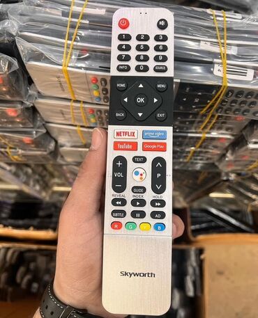 - Skyworth TV pultu – Home, Menu, Info, Source, OK/oxlar, Back/Exit, səs və kanal (VOL/APV) idarəsi, Guide/Index, media nəzarəti, Subtitle, rəngli R/G/Y/B düymələri. Tətbiq qısayolları: Netflix, Prime Video, YouTube, Google Play. Metal effektli korpus dizaynı.