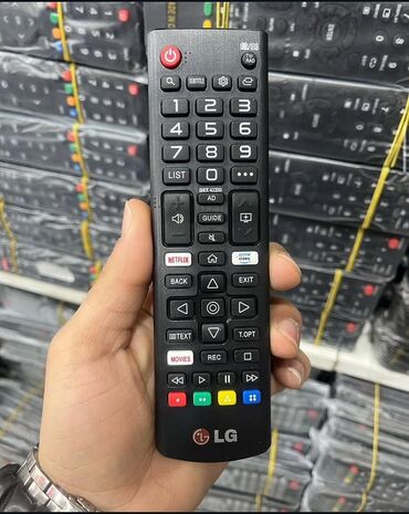 - LG Smart TV üçün Magic Remote (AKB75555301) – skroll təkəri, kursor idarəsi, səsli axtarış düyməsi, sürətli giriş (Quick Access), Guide, kanal və səs idarəsi, rəngli funksional düymələr. Xüsusi tətbiq düymələri: Netflix, Prime Video, Movies.