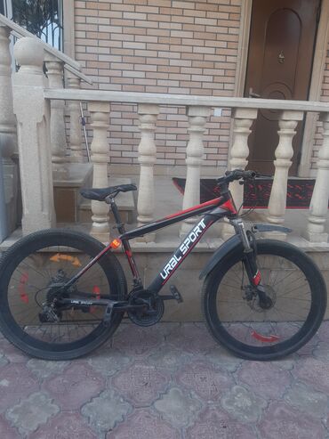 Ural Sport dağ velosipedi - Gövdə: alüminium ərintisi görünüşlü, “URAL SPORT” loqolu, düz üst borulu dizayn - Təkərlər: 29” clincher təkərlər, iri protektorlu şinlər; disk üçün hazırlanmış təkər m...