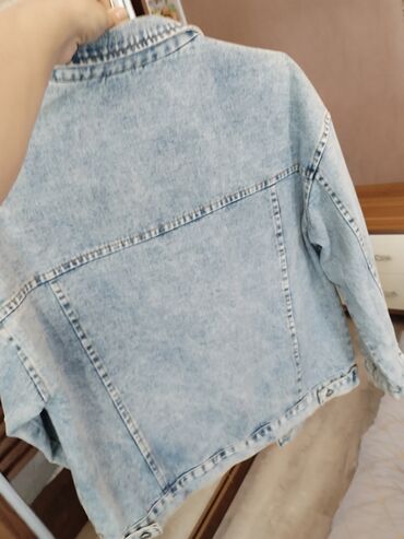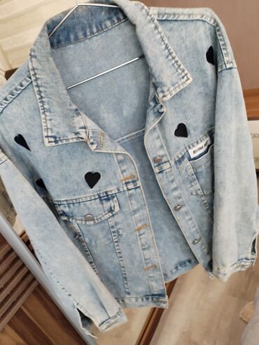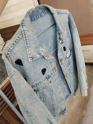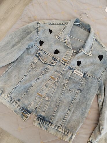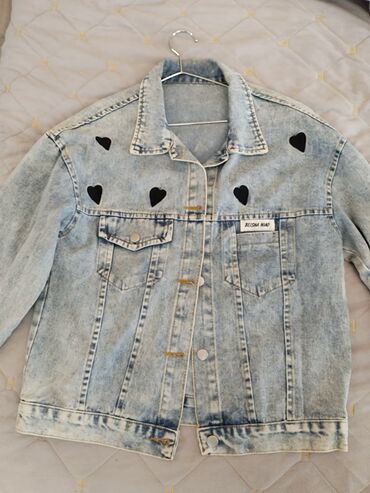 Açıq mavi yuyulmuş effektli cins gödəkçə. Ön hissədə qara ürək aplikasiyaları ilə bəzədilib. Klasik düyməli bağlanma, çevik yaxa, çiyin tikişləri. Üstdə iki qapaqlı sinə cibinə əlavə olaraq yanlarda gizli ciblər. Ön paneldə “BLESHA MAD” yazılı kiçik label var. Kəsimi rahat, uniseks streetwear tərzinə uyğun. Gündəlik kombinlər, soyuq axşamlar və laylı geyim üçün ideal. Material: 100% denim (pambıq qarışımı ola bilər). Rəng: açıq göy, ağaran kənar detallarla. Dizaynda həm klassik, həm də romantik üslub elementləri birləşdirilib.