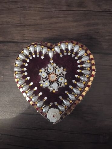 - Ürək formasında bəzək qutusu: qapağın iç tərəfində dairəvi güzgü, bordo məxmər görünümlü səth, kənarlarda parlaqlıq verən daşlar və muncuq aplikasiyaları. Xarici hissədə mirvari effekti olan damla muncuqlar, qızılı və qırmızı payetlər, naxışlı çiçək detallar. Daxili hissə çoxqatlı tekstil ilə işlənib, şarf/mücevher üçün yumşaq yataq, mərkəzdə asqılı damla daş bəzəyi. Qulaq sırğası, üzük, broş və xırda aksessuarların saxlanması üçün münasib.