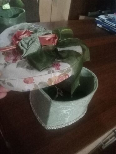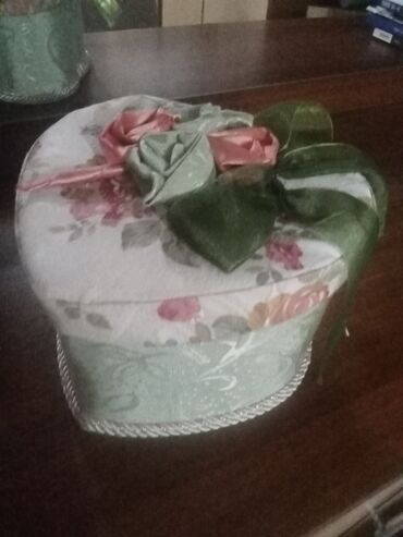 - Rənglər: Açıq mavi-yaşıl əsas, üst hissədə çiçək naxışları; qapaqda yaşıl və çəhrayı atlas lentdən hazırlanmış güllü kompozisiya