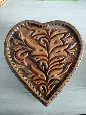 Bu, əl işi olan taxta qutudur, ürək formasında hazırlanmışdır. Qutunun xarici səthi detallı oyma naxışlarla bəzədilmişdir. Üst hissəsində açılan kiçik bir ürək formalı bölmə var. Bu kiçik bölmənin ...Giriş•Qeydiyyat