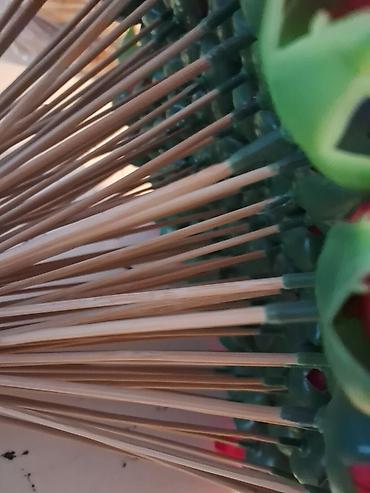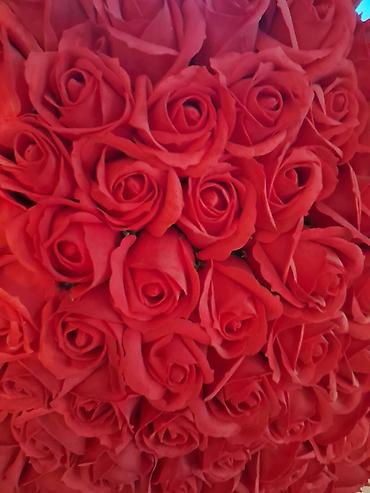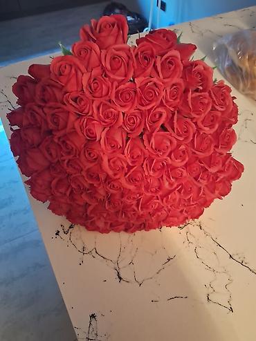 Əldə hazırlanmış dekorativ çiçək kompozisiyası - Material: ipdən toxunmuş süni güllər və yarpaqlar, möhkəm tel karkas, dekorativ sap və incilər - Rənglər: qırmızı güllər, yaşıl yarpaqlar; çəhrayı-...