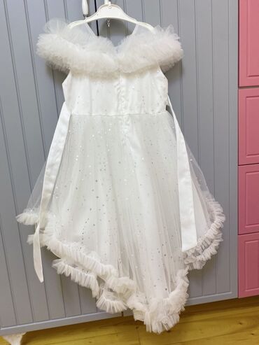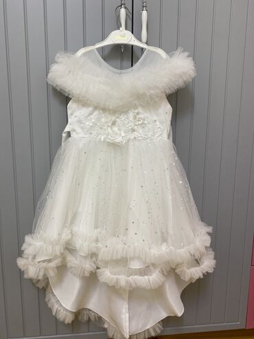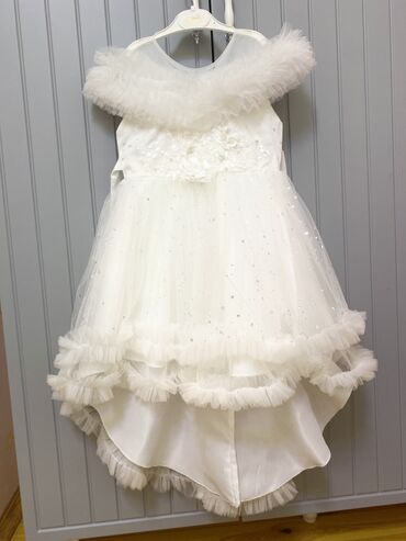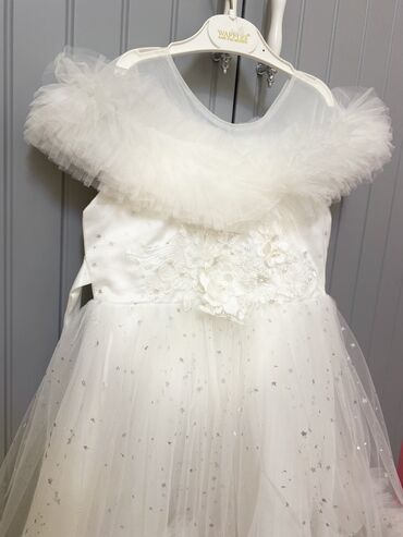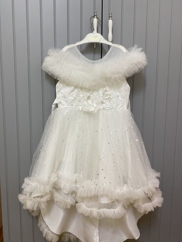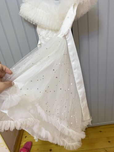 Ağ rəngli qız uşaq paltarı 1 dəfə istifadə edilib - Model: klassik A-kəsim, ətəyi dalğalı və həcmlidir - Material: parıldayan atlas/şifon tipli parça, yüngül və zərif - Rəng: saf ağ - Üst hissə: qo...