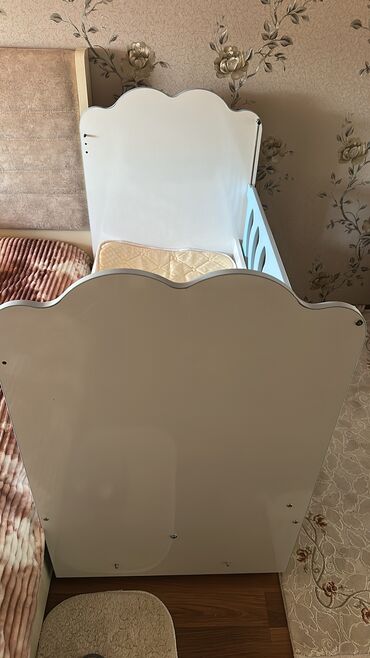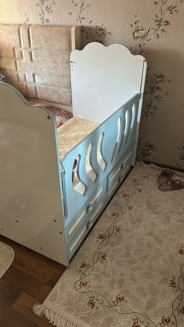 Uşaq beşiyi – yan tərəfi sürüşən qoruyucu barmaqlıq və alt hissədə çekmecələr