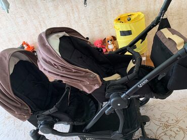 İki uşaq üçün nəzərdə tutulmuş, qəhvəyi və qara rənglərdə olan bu uşaq arabası, paralel oturacaq tənzimləməsinə malikdir. Hər bir oturacaq ayrı-ayrı tənzimlənən günəşliklərlə təchiz olunub. Sağ tərəfdəki oturacaq tamamilə uzanmış vəziyyətdə, sol tərəfdəki oturacaq isə oturmuş vəziyyətdədir. Hər iki oturacaq üçün təhlükəsizlik kəmərləri və ön qoruyucu çubuqlar mövcuddur. Təkərləri möhkəm və dayanıqlıdır, bu da arabaya sabitlik verir. Alt hissədə əşyalar üçün geniş səbət yerləşir. Bu araba əkizlər və ya yaş fərqi az olan bacı-qardaşlar üçün rahat və funksional bir həlldir.