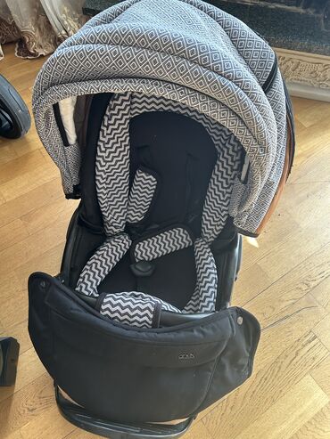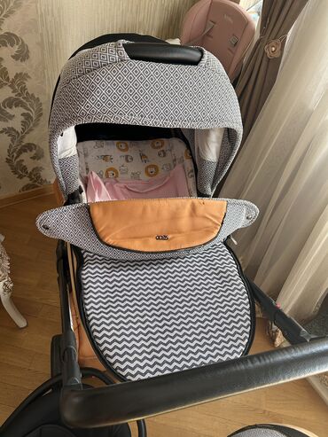 Portativ uşaq arabası, tünd qəhvəyi və boz rənglərin ahəngində. Dəri teksturalı qəhvəyi hissələri və boz rəngli ziqzaq naxışlı parçası ilə göz oxşayır. Arabanın təkərləri fərqli ölçülərdədir; ön təkərlər arxa təkərlərdən daha kiçikdir, bu da manevr qabiliyyətini artırır. Qara rəngli metal çərçivə möhkəmlik və dayanıqlıq təmin edir. Uşaq arabasının tənzimlənə bilən qolu və geniş örtüyü var, bu da uşağı günəşdən və küləkdən qorumağa kömək edir. Rahat və praktik istifadə üçün nəzərdə tutulmuşdur.