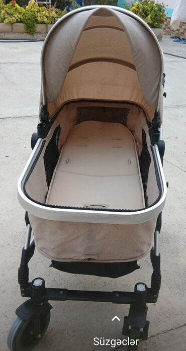 Uşaq arabası – bej rəngli, klassik beşik tipli model Xüsusiyyətlər: - Geniş beşik bölməsi: körpə üçün rahat yuxu və gəzinti imkanı. - Tənzimlənən böyük qapaq/kapot: günəş və küləkdən qorunma. - Be...