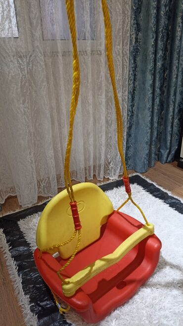 Uşaq yelləncəyi – asılqan ipli, oturacaqlı model - Rəng: qırmızı-gövdə, sarı arxa dayaq və ön qoruyucu barmaqlıq - Material: qalın, möhkəm plastik - Asma sistemi: 2 ədəd qalın hörgülü sarı ip, hün...
