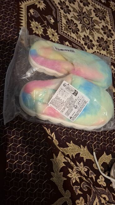 - Ev üçün yumşaq tüklü tapşırıq (şlapa): göy-çəhrayı-yaşıl keçidli rənglər, qalın yüngül altlıq, paketindədir.