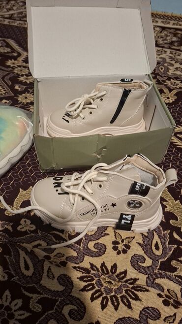 - Uşaq idman tərzli ayaqqabısı: krem rəng, yüksək boğaz, bağlama ilə; yan hissədə dekorativ qara fermuar, arxa dartma ilməsi, qalın, yastıqlı altlıq. Üzərində “Fashion Sport” yazılı dekor elementləri var. Qutusu ilə birlikdə.