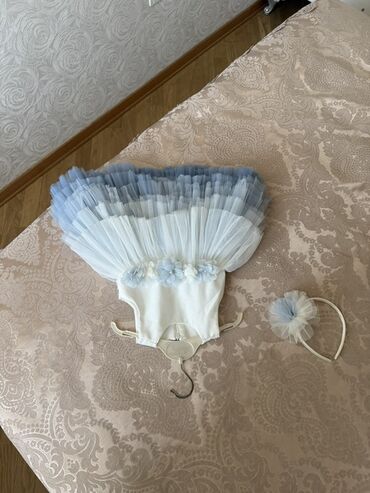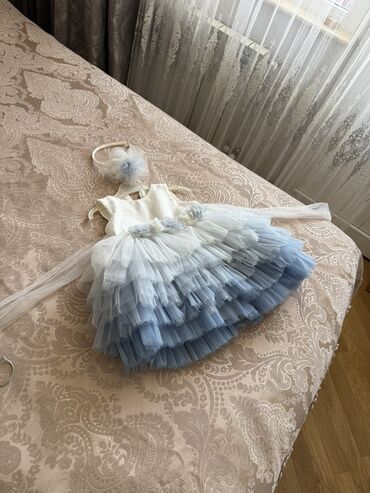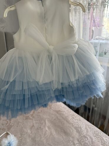 Uşaq/gecəlik ziyafət paltarı – açıq mavi rəngdə. 1defe de geyinilmeyib,cox gozel - Model: yuxarı hissəsi krujeva (naxışlı) parçadan, aşağı hissəsi çoxqatlı şifon/orqanza ətək - Üst hissədə daş və ...