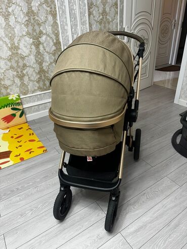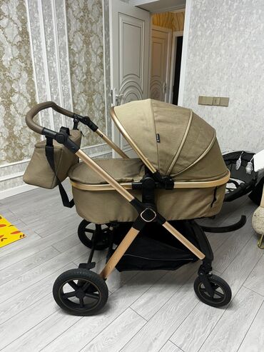 Uşaq arabası – beşik tipli, krem rəngli kumaş və qızılı/şampan tonlu alüminium karkas. Xüsusiyyətlər: - Beşik tipli üst modul: yeni doğulanlar üçün geniş və dərin beşik, qapaqlı-baldaxanlı. - Tənz...