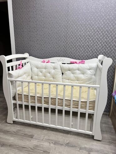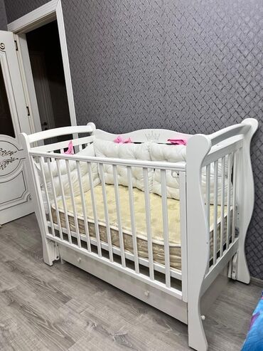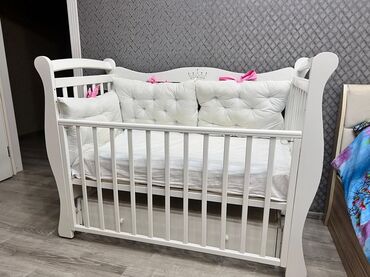 Ağ rəngdə, taxta uşaq beşiyi təklif olunur. Beşik, künclərdə yüngül əyri detallara və baş tərəfində oyma tac motivinə malikdir. Alt hissəsində iki saxlama siyirməsi var, bu da uşaq otağında əlavə yer təmin edir. İçərisində ağ rəngli döşək və dörd ədəd yumşaq, ağ yastıq mövcuddur. Rahat və funksional dizaynı ilə bu beşik, yeni doğulmuş körpələr üçün idealdır.Oyuncaqlar, uşaq geyimləri və digər əşyaları səliqəli şəkildə saxlamaq üçün siyirmələr praktik həll təqdim edir. Bütün komponentlər, uşağın təhlükəsizliyini təmin etmək üçün standartlara uyğun hazırlanmışdır. Rusiyya istehsalı , Lel firması 600 azn almışam , 180 azn satıram problemi yoxdur cox rahat krafatdı matrasla birlikdə satılır və yanlarının yastıqlaıda daxildir🌸