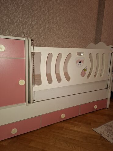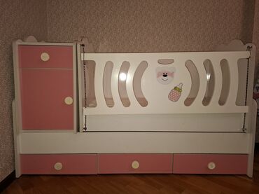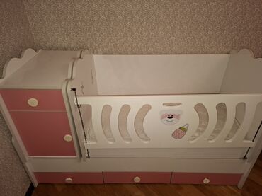 Uşaq beşiyi – funksional və rahat model - Material: ağ və taxta effektli yan panellər (rustik boz-ağ tekstura), möhkəm konstruksiya - Ön tərəf: aşağı-yuxarı hərəkət edən qoruyucu barmaqlıq (əl ilə...