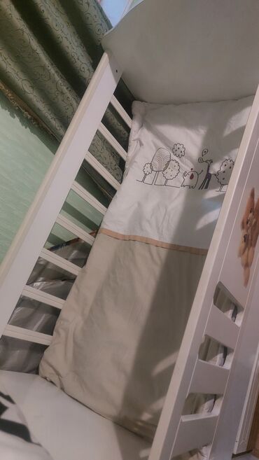 - Daxilə uyğun yataq dəsti göstərilib (şəkildə: ağ/bej rəngli, heyvan və ağac naxışları)