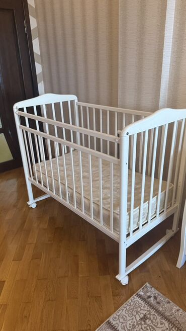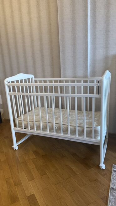 Uşaq beşiyi – klassik ağ rəngdə, taxta karkaslı.
