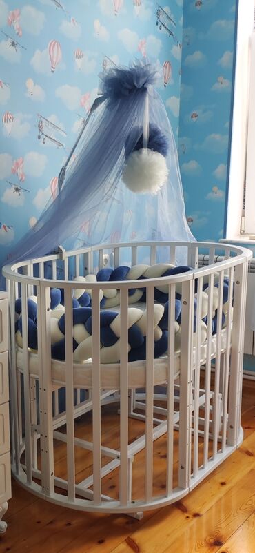 Ağ rəngli transformasiya olunan uşaq beşiyi - Oval/yuvarlaq dizayn, ağ rəngdə taxta konstruksiya - Lyulka və beşik funksiyası: kiçik körpə üçün yuvarlaq lyulka, böyüdükcə uzadılan oval beşik forma...