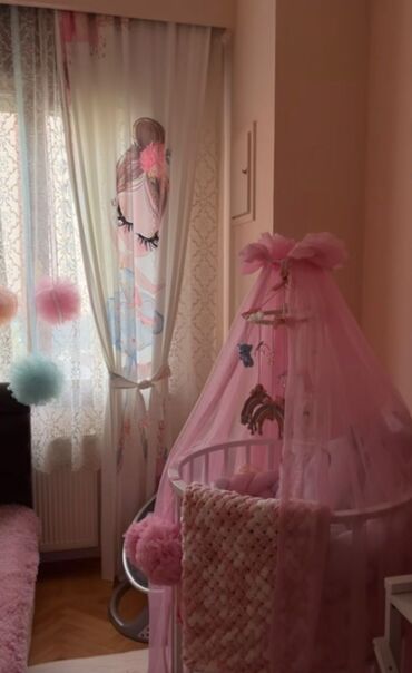 - Üst hissədə çəhrayı tull pərdə/çarşaf baldaxını, yuxarıdan asılan dekorativ mobil (rəngli göy qurşağı və fiqurlar).