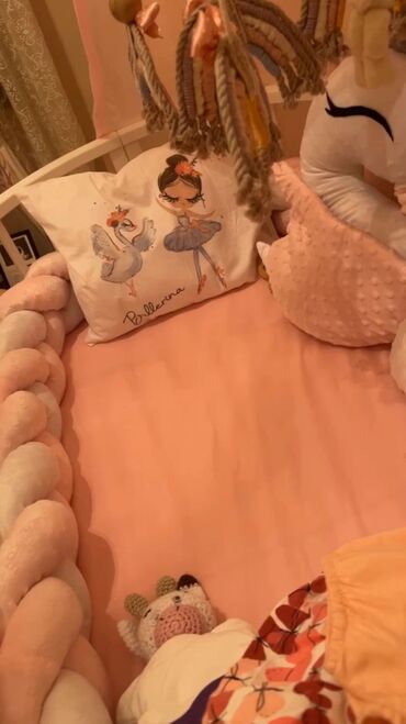 - Beşik üçün çəhrayı yataq dəsti: çarşaf, “Ballerina” printli yastıq üzlükləri.