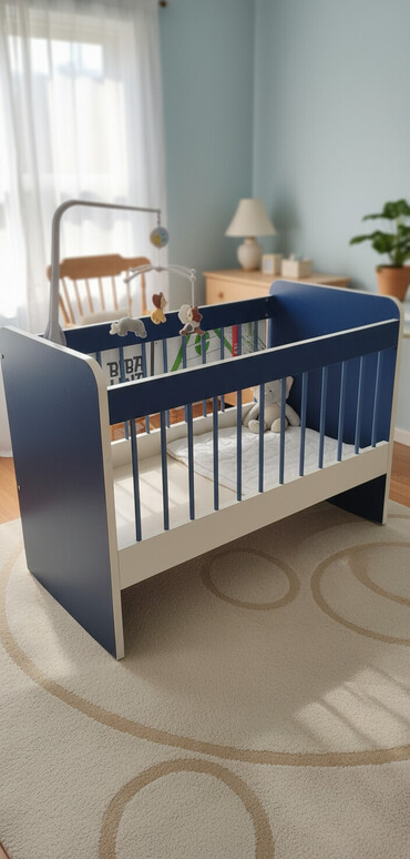 TƏCİLİ Uşaq beşiyi və döşək - Model: taxta/laminat konstruksiyalı körpə beşiyi - Rəng: tünd göy və krem tonlarının kombinasyonu - Ölçü: təxmini daxili ölçü 120×60 sm (standart körpə döşəyi ö...