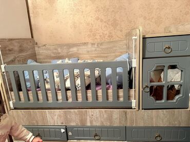 Körpənin rahat yatışı və gündəlik əşyaların səliqəli saxlanması üçün praktik həll. Dəst tək mebel komplekti kimi istifadə olunur; beşik, alt çekmecələr və yanında komod blokundan ibarətdir.