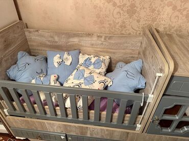 - Daxildə dekorativ yastıq və bordür dəsti: mavi və krem tonlarda, naxışlı, fiqurlu yastıqlar