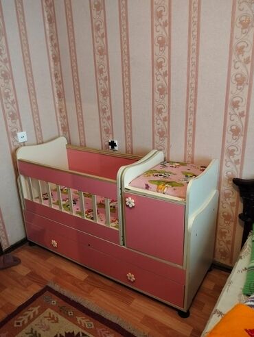Uşaq beşiyi – kombinə edilmiş beşik və komod - Rəng: ağ/çəhrayı, dekorativ çiçək formalı tutacaqlar - Material: laminat/taxta kombinasiyası - Beşik hissəsi: barmaqlıqlı, yüksək yan tərəflər; yuxar...