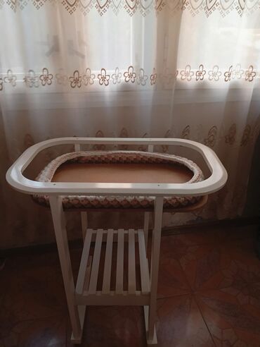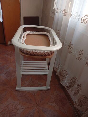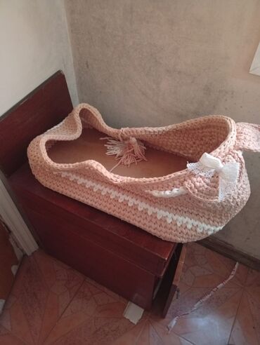- Əl işi toxunma səbət-beşik: qalın pambıq/parça ipdən toxunub, açıq şaftalı rəngində, ağ zolaq və krujeva bant detalları ilə. Yanları yüksəkdir, körpəni əhatə edir. İç hissədə yumşaq bağlama saçaq dekoru var. Yüngül və daşımağa uyğun quruluş.