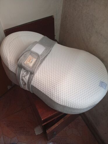 - Ortopedik körpə yatağı/matras: boz-ağ rəngdə, nəfəsalan teksturalı parça örtük. Körpəni sabit saxlayan geniş, tənzimlənən velkro kəmər mövcuddur. Kənarları yumşaq, forması ergonimikdir, yeni doğulanlar üçün rahat yuva effekti yaradır. Örtüyün yana tərəfində düyməli bağlama hissəsi var.